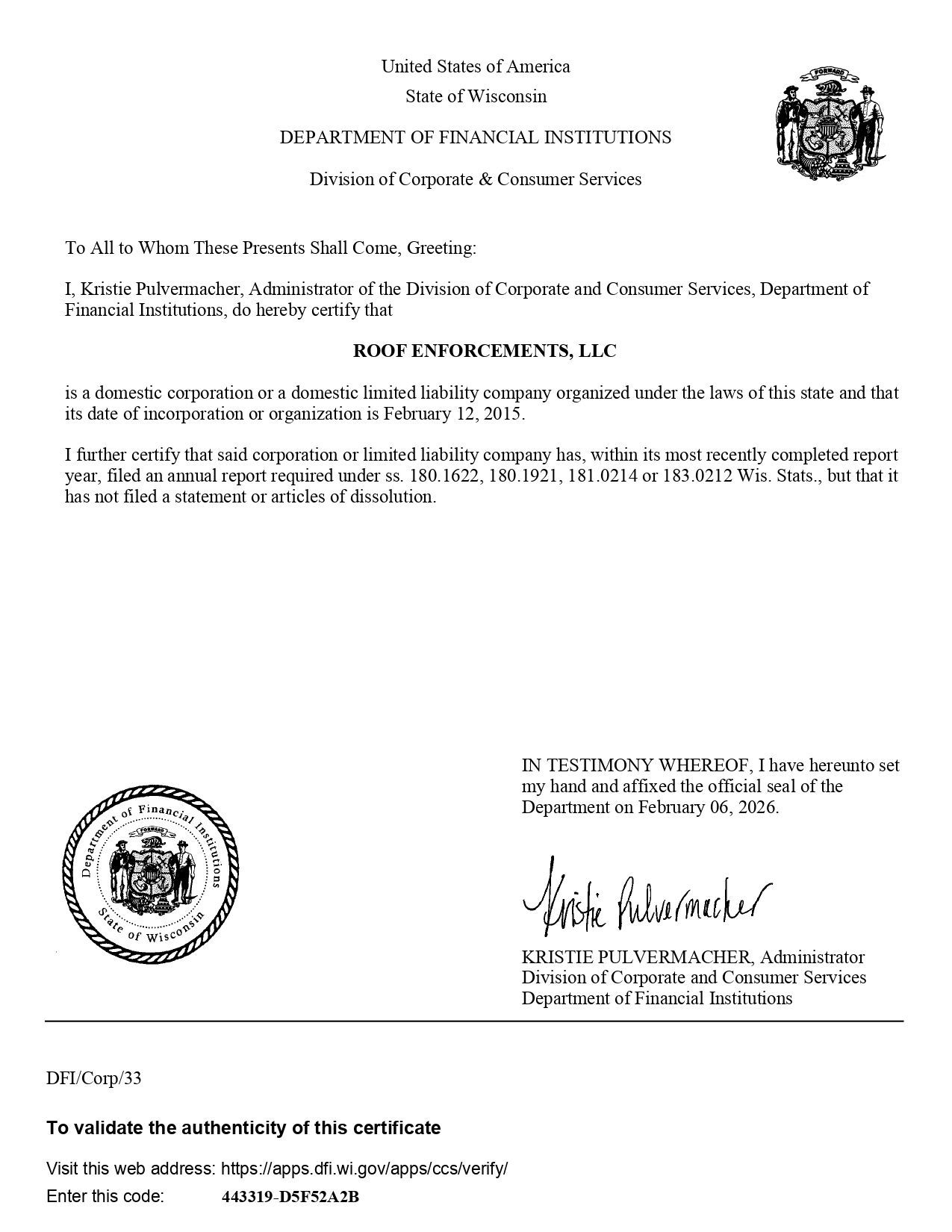 Roof Enforcements is a residential roofing company offering residential roof installations and repairs, storm damage and insurance claims assistance in Winnebago, Waupaca, Outagamie, Calumet, Fond du Lac, Green Lake and Waushara counties.